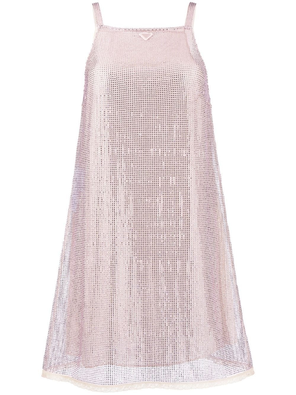 rhinestone-embellished mesh minidress Prada's mesh minidress is minimally detailed with the brand's signature triangle plaque at the square neckline. It's emblazoned with rhinestones that glitter from all angles. Composition Polyester 64%, Polyurethane 36% SIZE & FIT Model measurements Height 5 ft 10 in(1.77 m) Bust/Chest 32.67 in(83 cm) Hips 35.43 in(90 cm) Waist 23.62 in(60 cm) FittingInformation This piece fits true to size. We recommend you get your regular size Cut for a loose fit Made with a heavyweight fabric