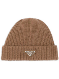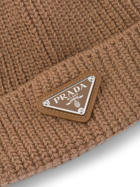 ribbed-knit cashmere beanie Woven from camel-brown cashmere, this Prada beanie showcases the brand's iconic enamel triangle logo at the turn-up hem. It boasts a ribbed knit construction that ensures that cosy feeling. Highlights - Camel brown - Cashmere - Ribbed knit - Enamel triangle logo - Turn-up hem - Slip-on style Composition Cashmere 100%, Metal 100%, Leather 100%