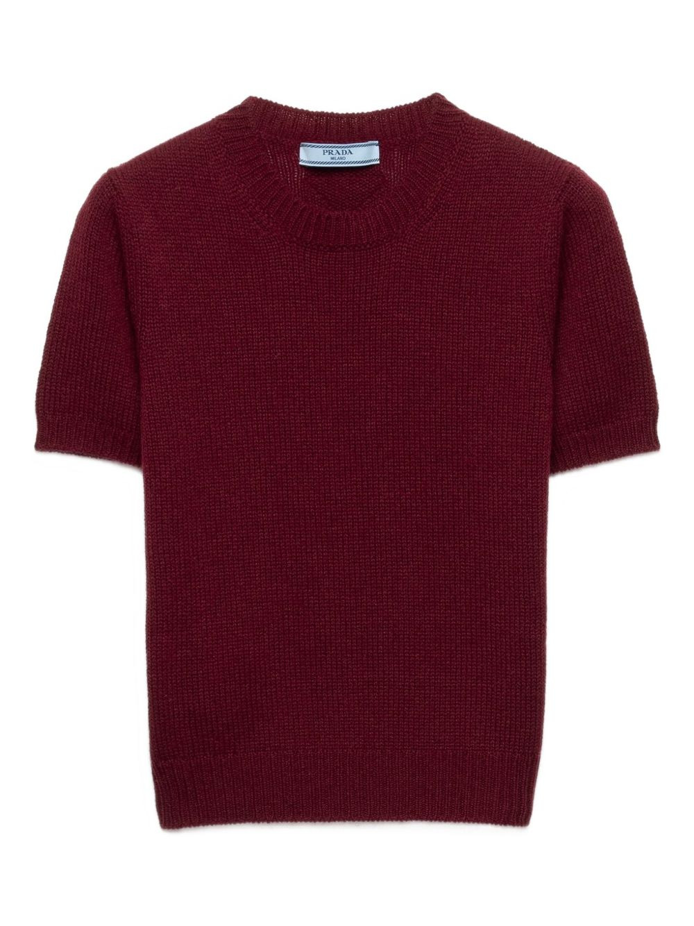 ribbed-knit cashmere sweater Highlights - Burgundy - Ribbed knit - Crew neck - Short sleeves - Ribbed cuffs hem - Knit triangle logo Composition Cashmere 30%, Wool 30% Washing instructions Dry Clean Only