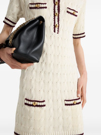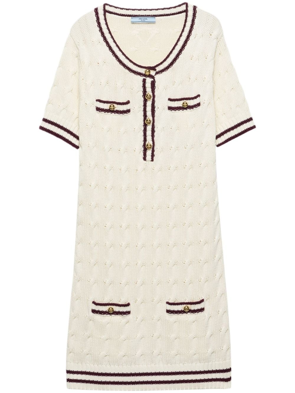 round-neck knitted cotton mini dress Highlights - White/multicolour - Knitted construction - Cotton - Round neck - Striped border - Short front button fastening - Two front patch pockets - Enamel triangle logo - Two front welt pockets - Short sleeves - Thigh-length Composition Cotton 100% Washing instructions Read Manufacturer Guidelines