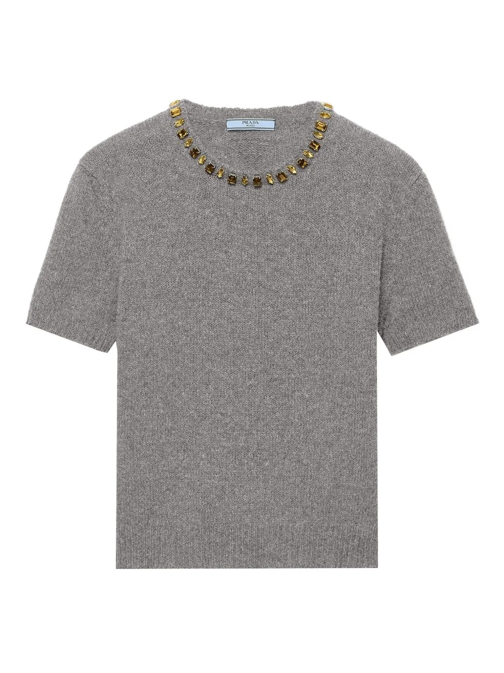 round-neck ribbed sweater Highlights - Grey - Ribbed knit neck - Appliqued jewel embellishment - Triangle logo Composition Virgin Wool 70%, glass 60%, Brass 40%, Cashmere 30% Washing instructions Read Manufacturer Guidelines