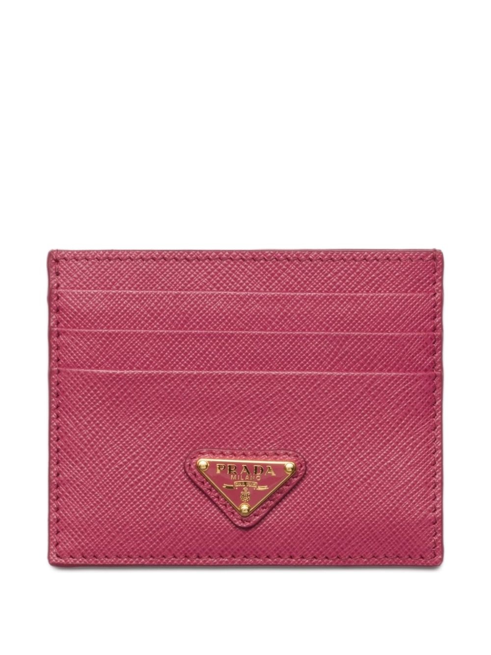 Saffiano leather card holder Highlights - Pink - Card slots - Internal pocket - Enamel triangle logo Composition Outer: Calf Leather 100%