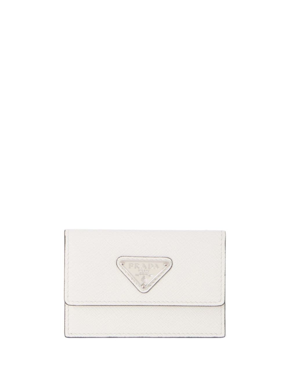 Saffiano leather card holder Highlights - White - Saffiano leather - Textured finish - Enamel triangle logo - Rectangle shape - Foldover top with press-stud fastening - Internal card slots Composition Outer: Leather 100%