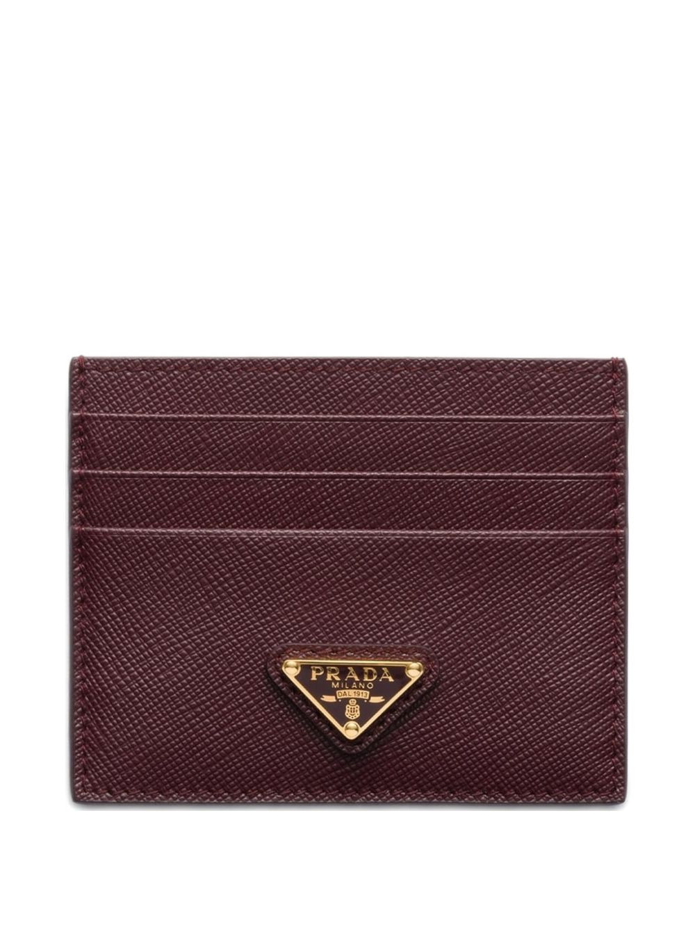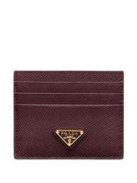 Saffiano leather card holder Highlights - Burgundy - Saffiano leather - Enamel triangle logo - Six card slots - Inside pocket Composition Lining: Saffiano Leather 100% Outer: CALFSKIN 100% SIZE & FIT Measurement LENGTH 3.14 in(8 cm) WIDTH 3.93 in(10 cm)