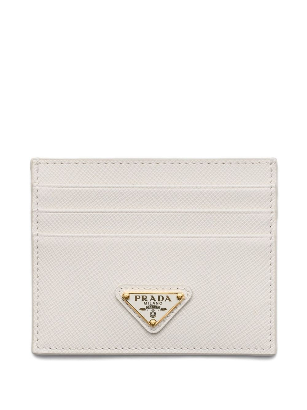 Saffiano leather cardholder Highlights - Cream - Textured finish - Gold-tone logo plaque - Four card slots - Slim profile Composition Outer: CALFSKIN 100% SIZE & FIT Measurement LENGTH 4.4 in(11.2 cm) WIDTH 3.34 in(8.5 cm)