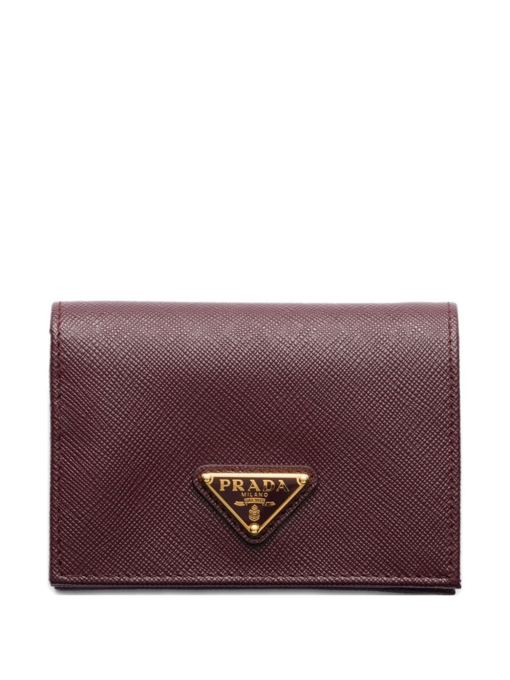 Saffiano leather compact wallet Highlights - Burgundy - Gold-tone logo plaque - Snap closure - Card slots - Internal zip pocket Composition Outer: Calf Leather 100% SIZE & FIT Measurement HEIGHT 4.4 in(11.2 cm) WIDTH 3.34 in(8.5 cm)