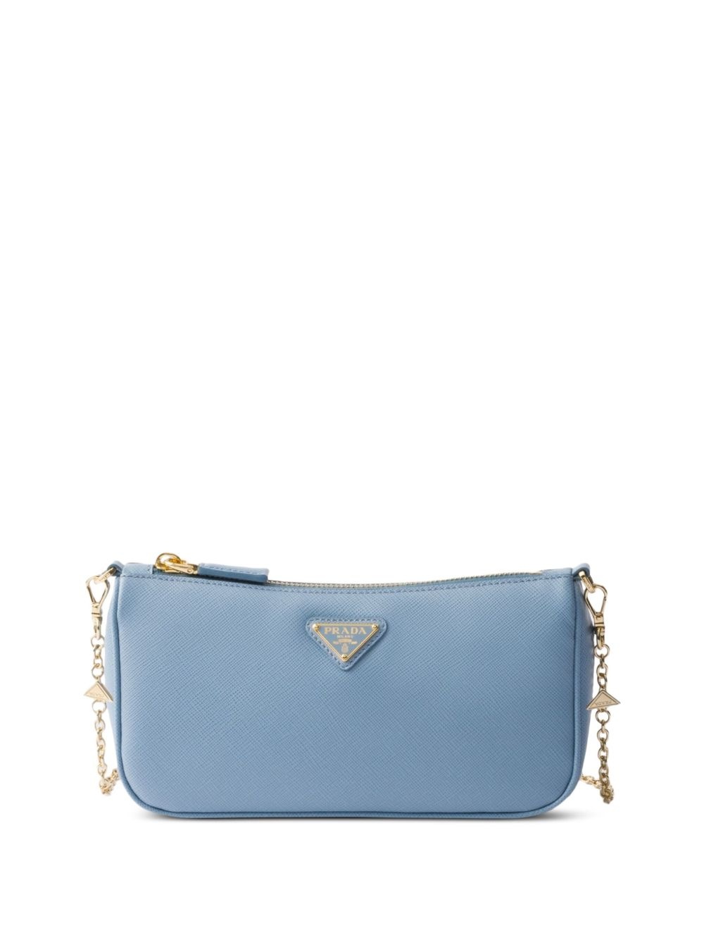 Saffiano leather mini bag Highlights - Light blue - Top zip fastening - Detachable chain-link shoulder strap - Enamel triangle logo - This piece comes complete with a protective dust bag. Composition Outer: CALFSKIN 100% SIZE & FIT Measurement DEPTH 1.96 in(5 cm) HEIGHT 4.33 in(11 cm) WIDTH 8.07 in(20.5 cm)