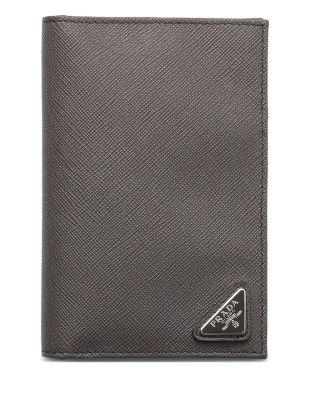 Saffiano leather passport holder Highlights - Anthracite grey - Bi-fold design - Internal card slots - Internal note compartments - Enamel triangle logo Composition Outer: Saffiano Leather 100% Lining: Saffiano Leather 100% SIZE & FIT Measurement LENGTH 5.51 in(14 cm) WIDTH 3.74 in(9.5 cm)