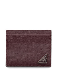 Saffiano-leather triangle-logo cardholder Highlights - Dark burgundy red - Saffiano leather - Enamelled triangle logo - Multiple card slots Composition Calf Leather 100%, Saffiano Leather 100% SIZE & FIT Measurement LENGTH 3.93 in(10 cm) WIDTH 3.14 in(8 cm)