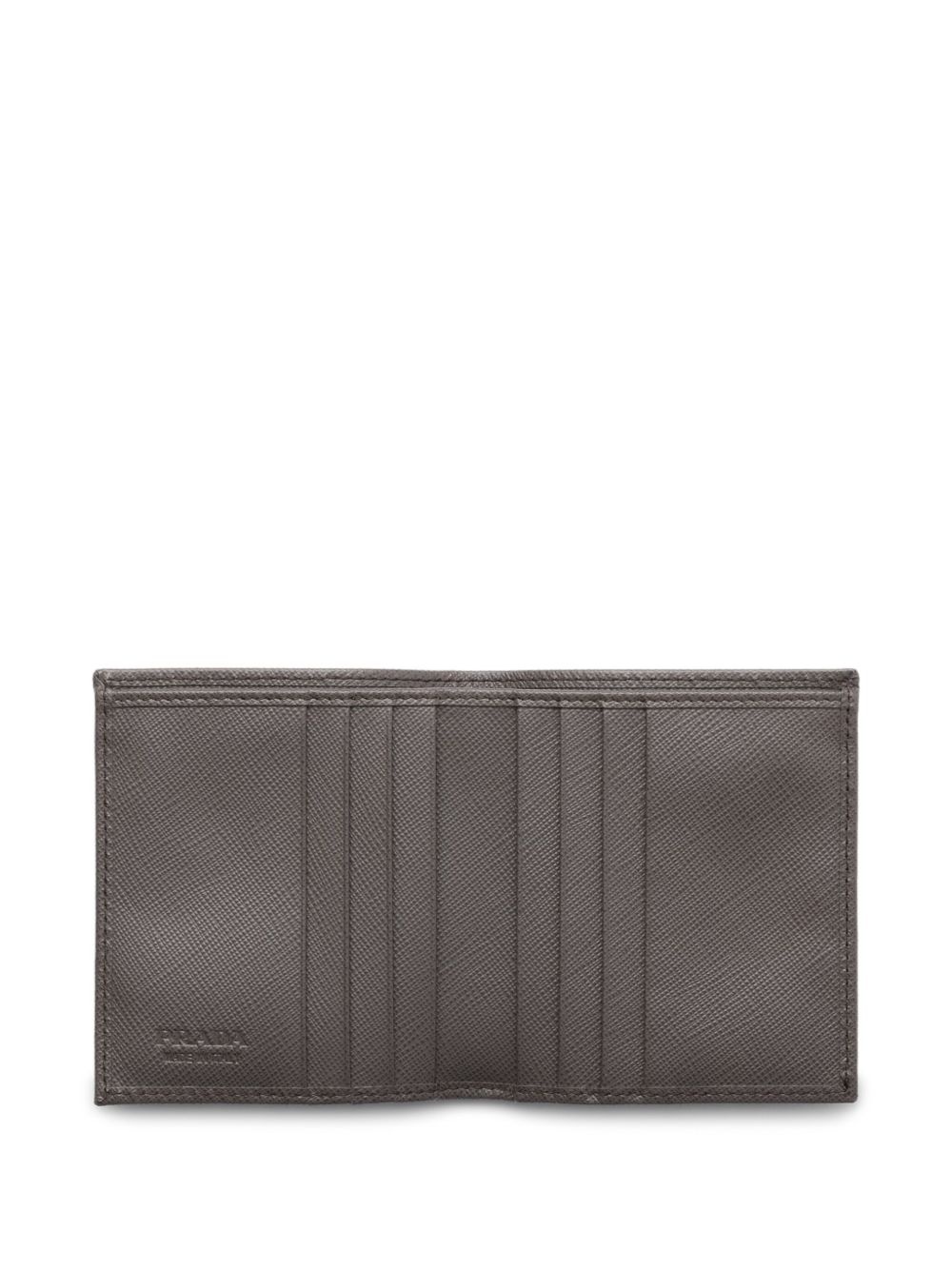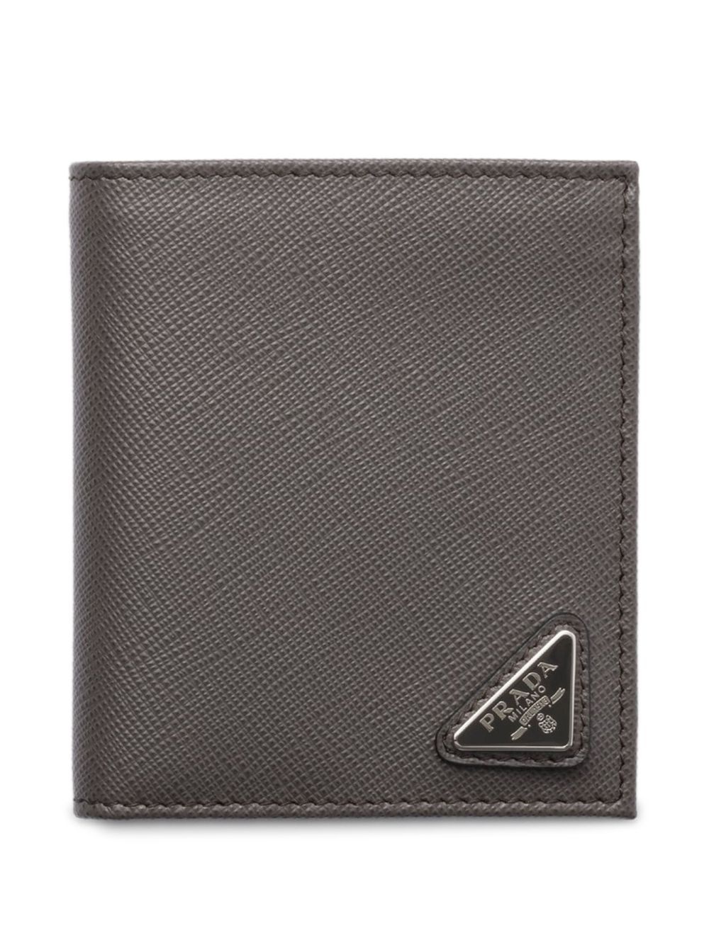Saffiano leather wallet Highlights - Anthracite grey - Bi-fold design - Internal card slots - Internal note compartments - Enamel triangle logo Composition Outer: CALFSKIN 100% Lining: Saffiano Leather 100% SIZE & FIT Measurement LENGTH 3.93 in(10 cm) WIDTH 3.54 in(9 cm)