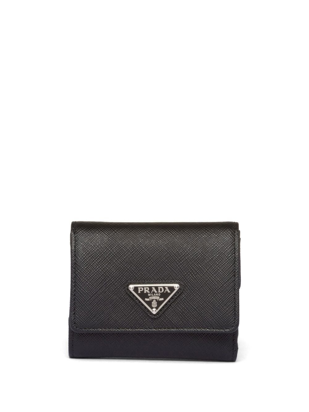 Saffiano leather wallet black leather enamel triangle logo press-stud fastening card slots partitioned compartment internal logo stamp silver-tone hardware Composition Outer: Leather 100%