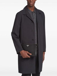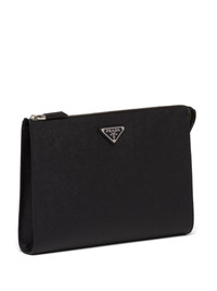 Saffiano triangle-plaque clutch bag Never be too far away from your favourite possessions with Prada. This leather Saffiano pouch bag is compact enough to never feel like a burden and spacious enough to carry your essentials without any issues. Grab it and go about your day with ease. Highlights - Black - Saffiano leather - Enamel triangle logo - Top zip fastening - Main compartment - Multiple internal slip pockets - Silver-tone hardware Composition Outer: Calf Leather 100% SIZE & FIT Measurement DEPTH 1.18 in(3 cm) HEIGHT 7.48 in(19 cm) WIDTH 10.23 in(26 cm)