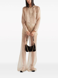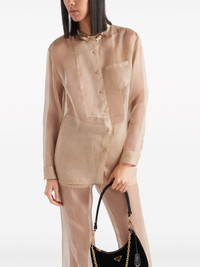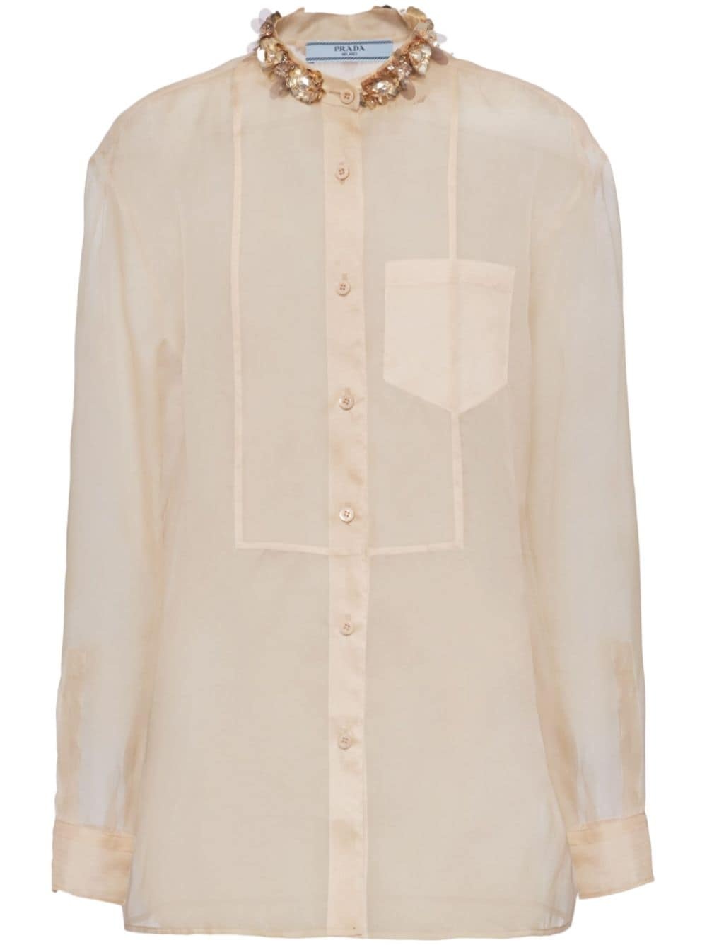 embroidered organza shirt The harmony between diaphanous fabric and shimmering embellishment infuses this beige Prada shirt with a romantic aura. Crafted from semi-sheer silk organza, it boasts a minimalist silhouette adorned along the collar with golden sequins formed into flowers. Highlights - Light beige - Silk - Organza - Semi-sheer construction - Sequin detailing - Band collar - Front button fastening - Long sleeves - Buttoned-cuff sleeves - Chest patch pocket - Straight hem Composition Silk 100% Washing instructions Read Manufacturer Guidelines