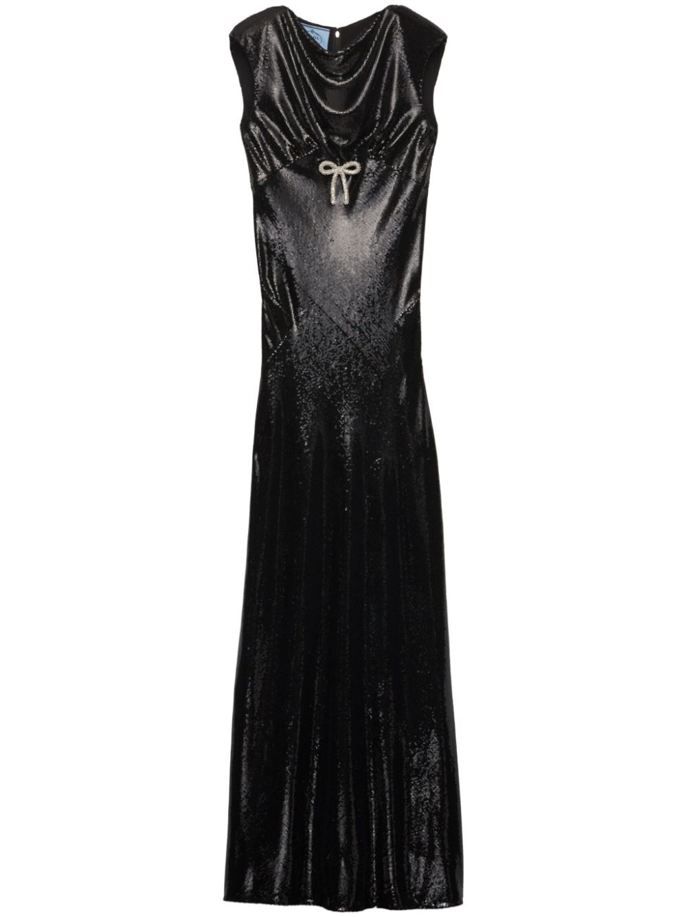 sequined satin long dress Highlights - Black - Concealed rear zip fastening - Bow detailing - Round neck - Sleeveless Composition Sequin 100%, Viscose 100%