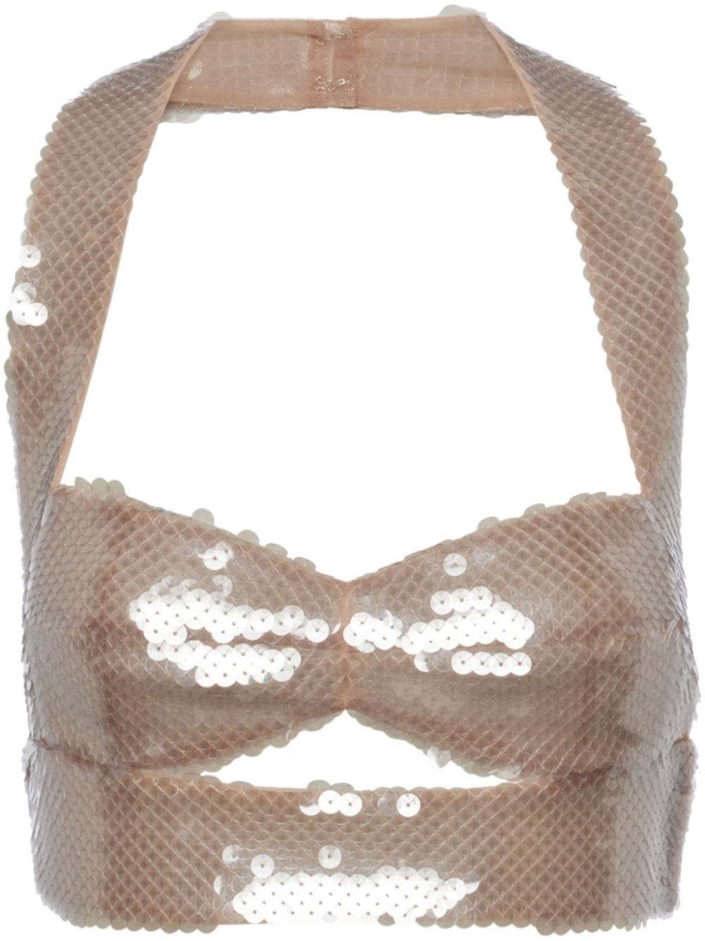 sequin-embellished tulle top Prada plays with textures and silhouettes, adding unexpected details to everyday staples. This night-out-inspired cropped top has a cropped cut fully covered in sequins for an eye-catching look. The brand's triangle logo is seen subtly adorning the back. Highlights - Grey sapphire - Sequin design - Enamel triangle logo - Halterneck - Sweetheart neck - Keyhole neck - Open back - Straight hem - Cropped Composition Nylon 100%, Sequin 100%