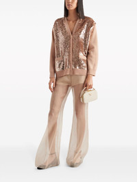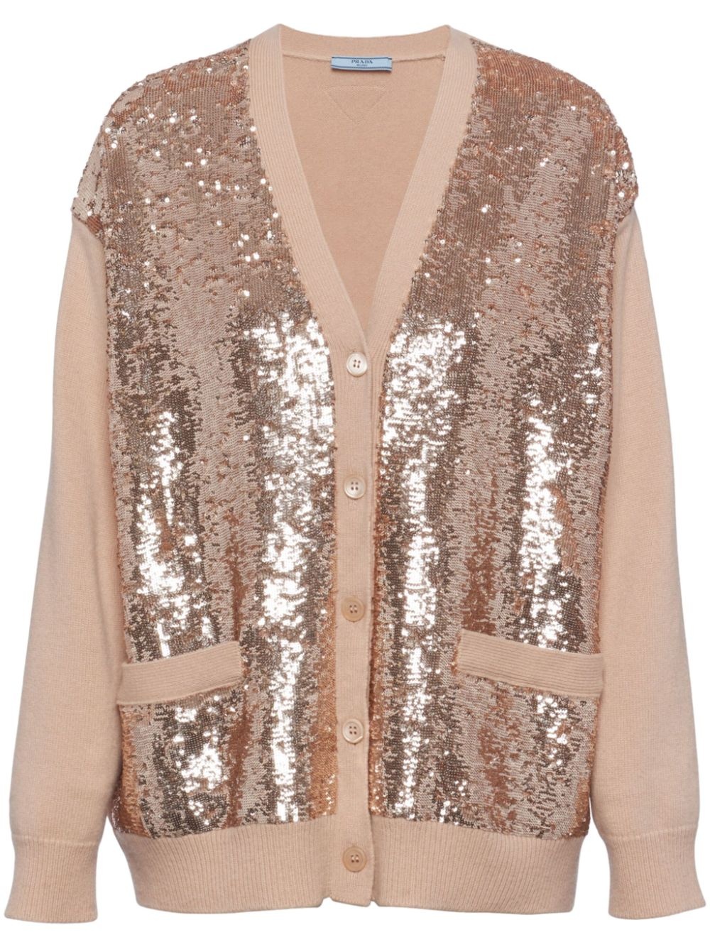 sequin-embellished cardigan Prada refreshes the humble cardigan with scores of glistening sequins. Spun from plush cashmere to a relaxed shape, it's subtly defined with ribbed trims. Highlights - Beige - Cashmere - Sequin embellishment - Ribbed trim - V-neck - Front button fastening - Two side welt pockets Composition Cashmere 100%