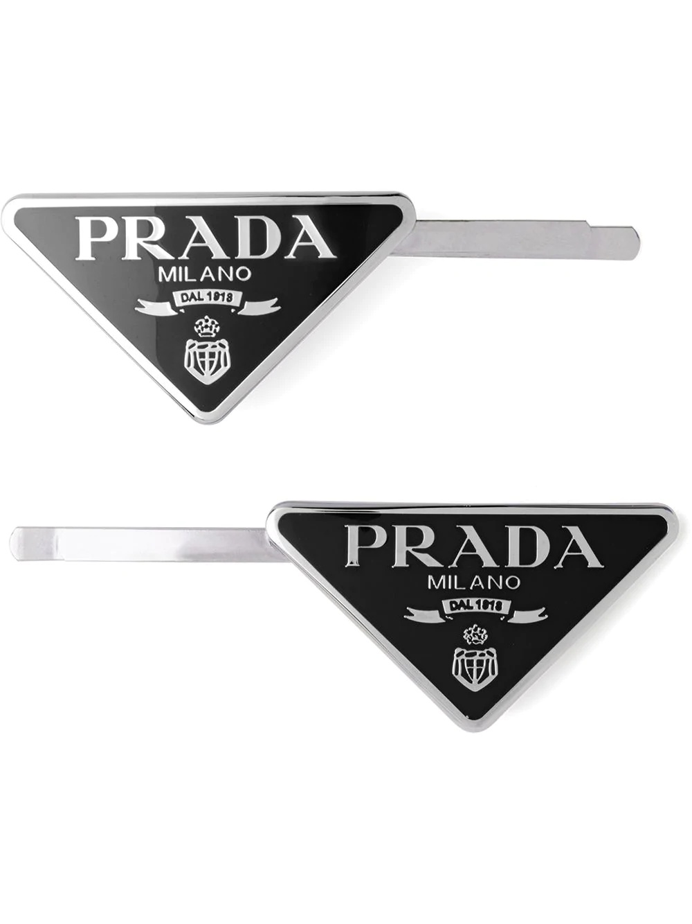 triangle-logo hair clips (set of two) Highlights - A well-rounded outfit wouldn't be complete without a proper hairstyle, itself not finished without this black set of two hair clips from prada. now, you can leave the house. featuring a logo plaque and a hinged structure. Composition Metal 100%