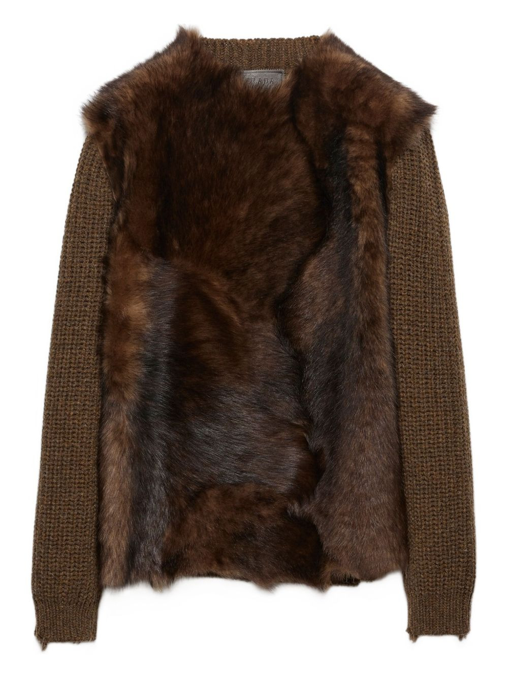 shearling wool sweater Highlights - Brown - Shearling - Ribbed knit - Distressed edges - Wool sleeves - Irregular shearling panels Composition Wool 100%, Lamb Shearling 100% Washing instructions Specialist Cleaning