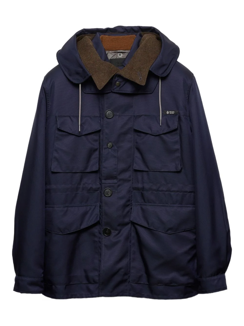 shirt-style hooded cotton jacket Highlights - Blue - Shirt-style collar - Hood - Zipper closure - Button fastening - Patch pocket - Cuffs strap Composition Recycled Polyamide 100% Washing instructions Read Manufacturer Guidelines