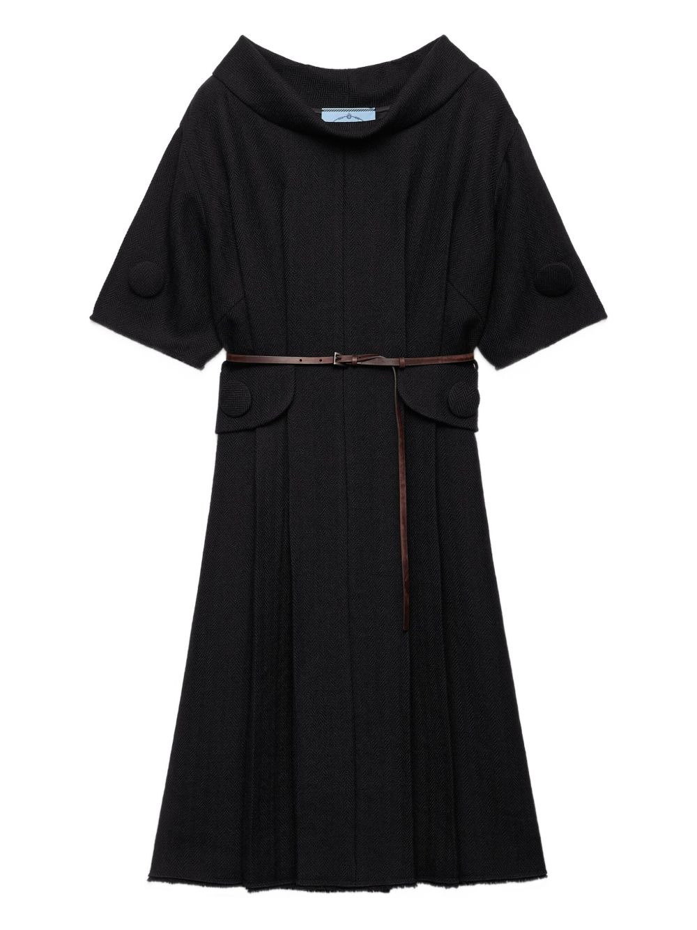 short-sleeve wool mini dress Highlights - Black - Wool - Herringbone pattern - Short sleeves - Belted waist - Button detailing - Centre back-slit Composition Wool 100% Washing instructions Read Manufacturer Guidelines