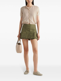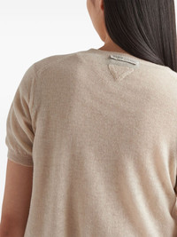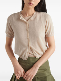 short-sleeved cashmere cardigan Boasting an understated design, this cashmere cardigan allows the premium composition to shine through. It's finely knitted in a short-sleeve silhouette, with buttons down the front and Prada's iconic triangle logo at the nape. Highlights - Light beige - Cashmere - Fine knit - Triangle logo - Crew neck - Short sleeves - Ribbed trim - Straight hem Composition Cashmere 100%