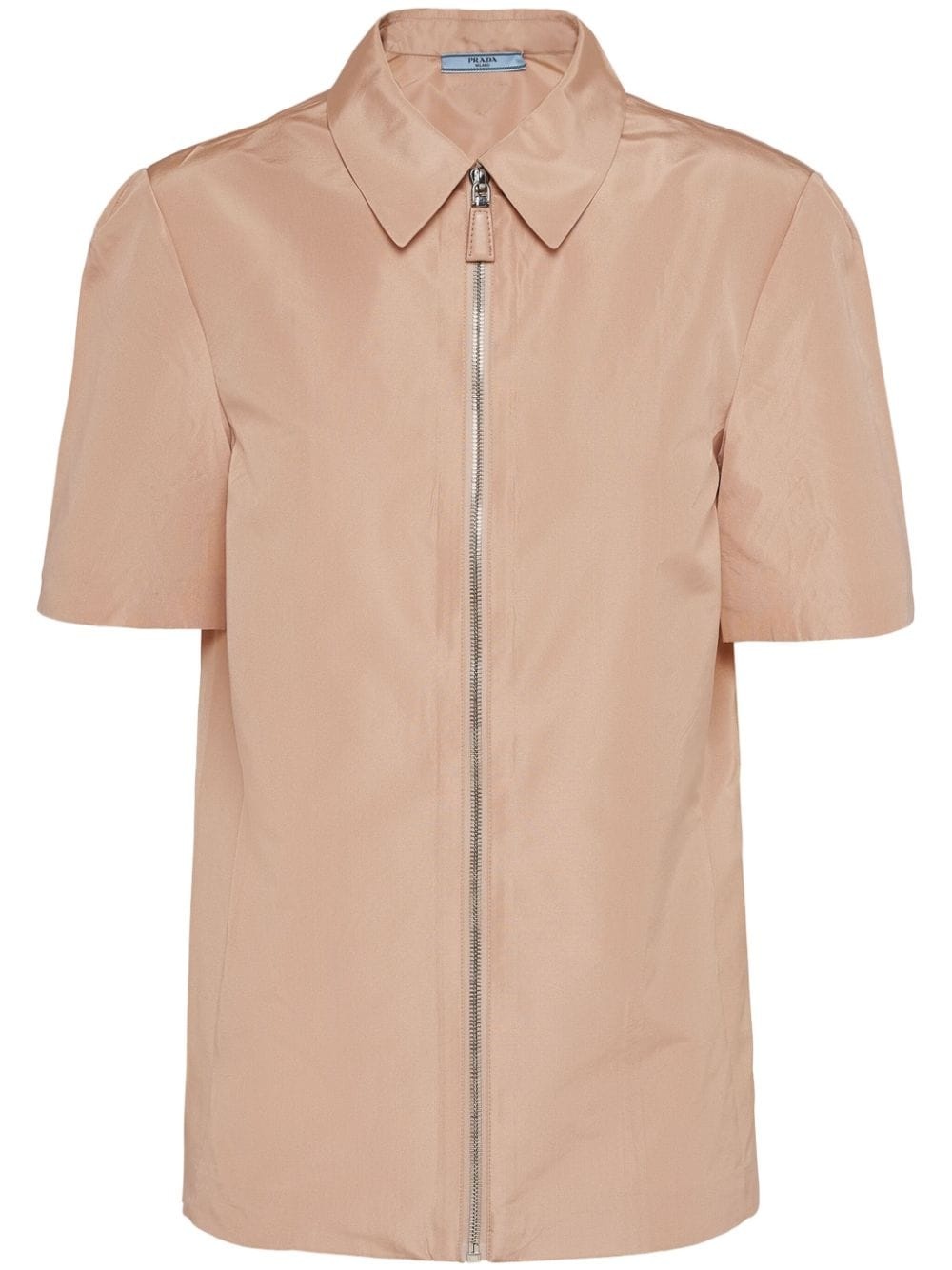 Short-sleeved faille shirt This Prada shirt has a sleek and simple design, with a beige silk fabric that gives it a refined look. Boasting a classic straight cut, it is enhanced with ruched details at the chest that provide a subtle touch of elegance. Highlights - Slim fit shirt collar front zipper closure short sleeves leather triangle logo straight hemsilk Composition Silk 100% Washing instructions Read Manufacturer Guidelines