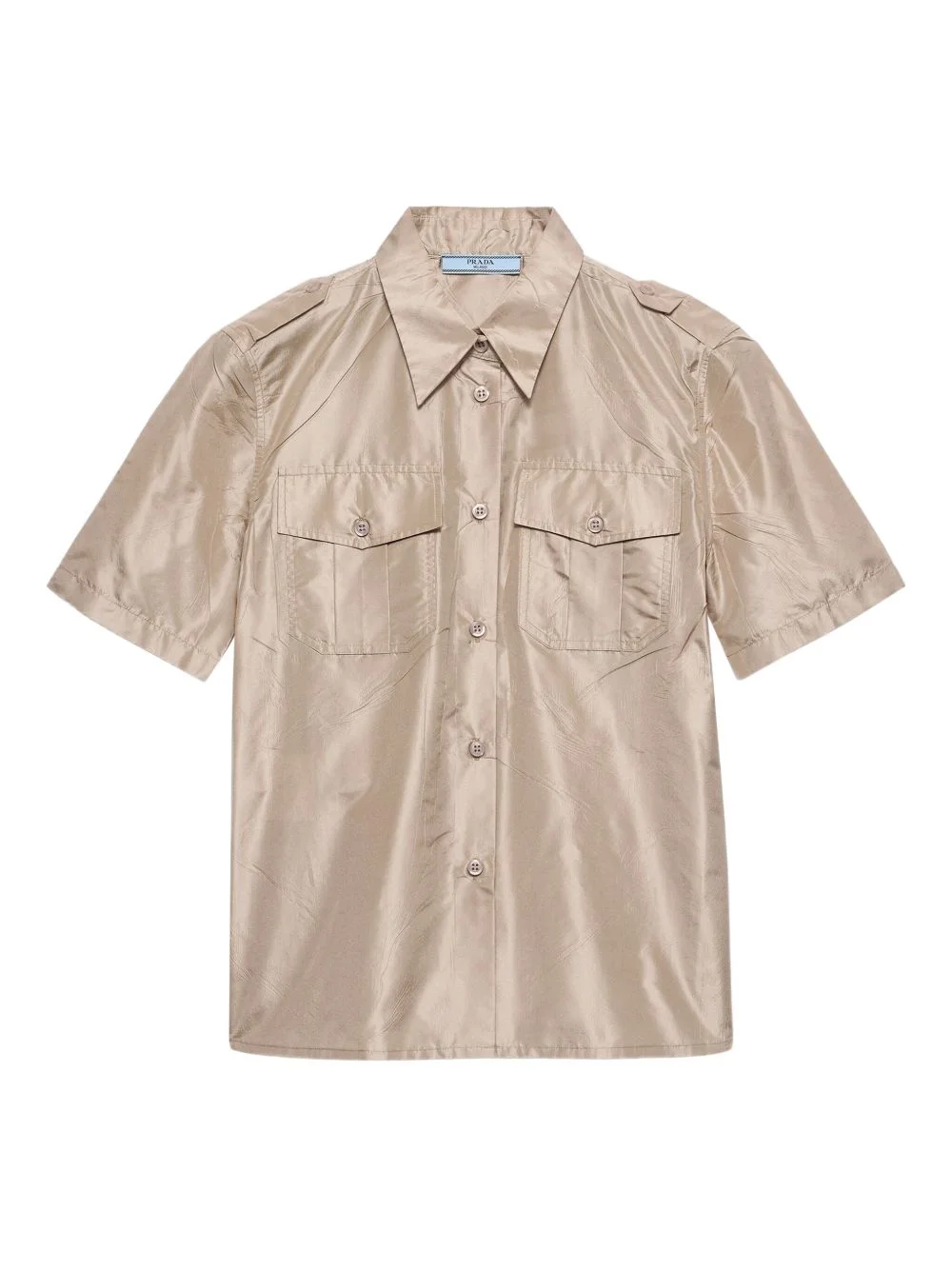 short-sleeved shirt Highlights - Beige - Classic collar - Button closure - Short sleeves - Flapped patch pockets - Fabric triangle logo Composition Body: Silk 100% Washing instructions Read Manufacturer Guidelines
