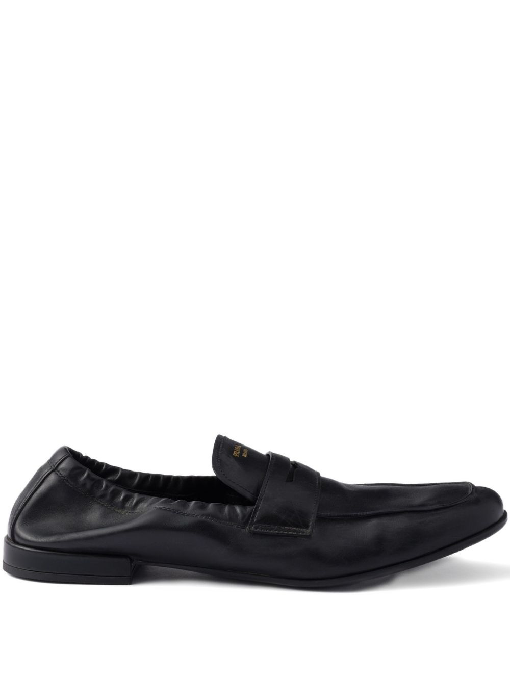 Shuffle antiqued screen-printed-logo loafers Highlights - Black - Leather - Embossed logo rubber sole - Leather-covered heel - Elasticated band - Screen-printed logo Composition Outer: Calf Leather 100% Sole: Calf Leather 100% Lining: Calf Leather 100%