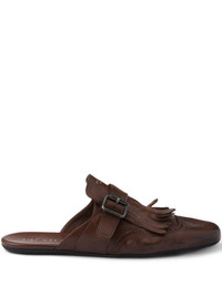 Shuffle antiqued leather mules with buckled strap and fringe