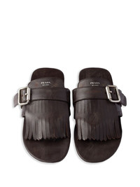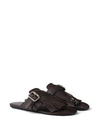 Shuffle sandals Highlights - Dark brown - Slip-on style - Front strap with buckle - Fringed detailing - Flat sole Composition Lining: Calf Leather 100% Sole: Rubber 100% Outer: Calf Leather 100%