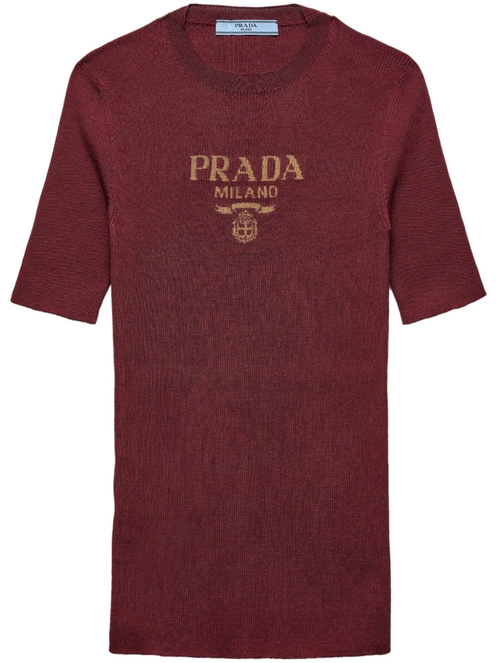 silk crew-neck top Highlights - Bordeaux red - Recycled silk - Knitted construction - Intarsia-knit logo - Round neck - Short sleeves - Straight hem Composition Recycled Silk 100%