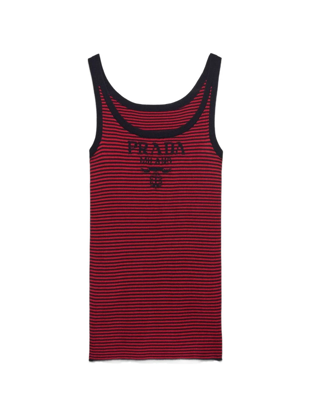 silk tank top Highlights - The sophisticated fluidity of silk gives a refined character to this striped tank top, a summer classic for everyday looks. the slim silhouette with skinny fit is completed with the - Prada - logo for a distinctive note. - Ribbed knit - Slim fit - Intarsia logo - The model is 179 cm tall and wears a size 38 Composition Recycled Silk 100% Washing instructions Read Manufacturer Guidelines