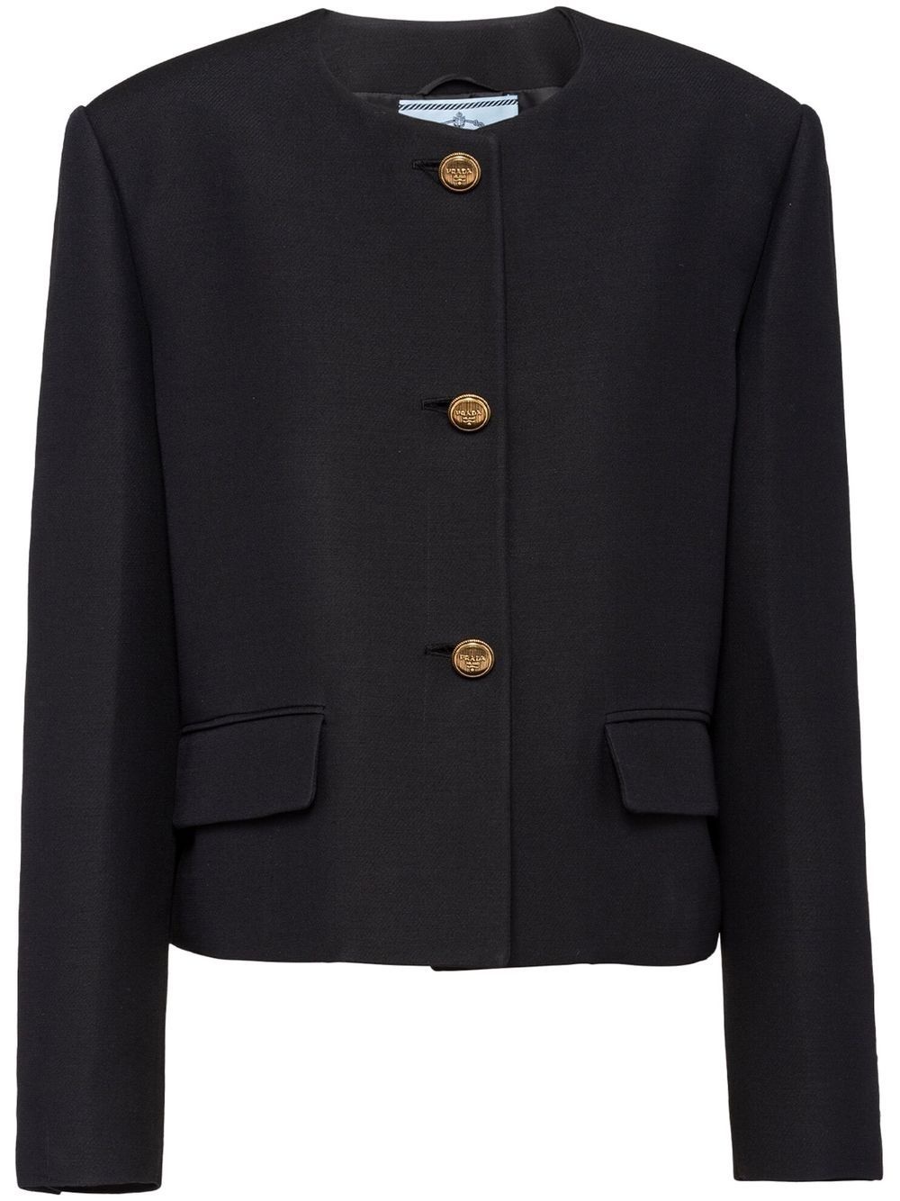 single-breasted tricotine jacket navy blue wool collarless front button fastening long sleeves two front flap pockets straight hem satin lining Composition Wool 100%