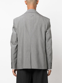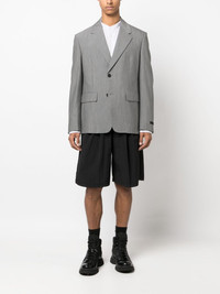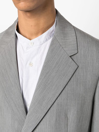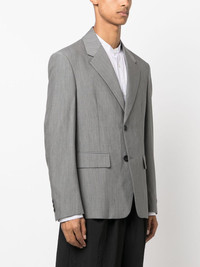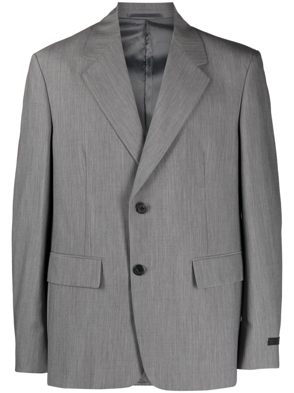 single-breasted wool-mohair blazer In a timeless tailored design, this Prada blazer is spun from virgin-wool and mohair offering an elegant look. Finished with the brand's signature triangle logo to the rear for an understated branded finish. Highlights - Grey - Virgin wool-mohair blend - Classic lapels - Two front flap pockets - Front button fastening - Shoulder pads - Long sleeves - Straight hem Composition Lining: Cupro 100% Outer: Virgin Wool 63%, Mohair 37% SIZE & FIT Model measurements Height 6 ft 2 in(1.87 m) Bust/Chest 38.18 in(97 cm) Hips 36.61 in(93 cm) Waist 29.13 in(74 cm) FittingInformation Designed for a boxy fit, intended for a loose fit throughout The internal shoulder pads offer a structured shape Made from a midweight non-stretch fabric This piece fits true to size – take your usual size