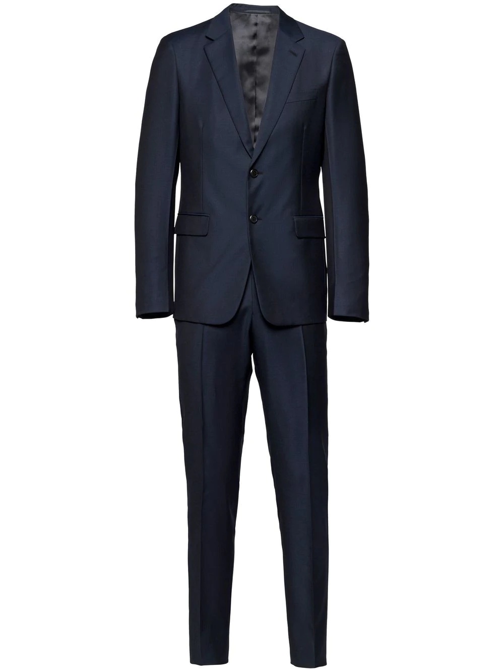 single-breasted wool suit navy wool Jacket: notched lapels chest welt pocket front button fastening long sleeves buttoned cuffs two front flap pockets Trousers: mid-rise concealed front fastening two side slit pockets slim cut Composition Wool 100%