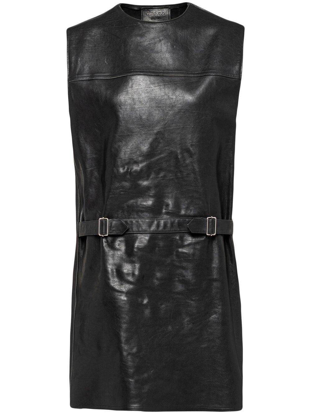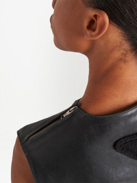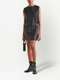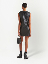 sleeveless leather mini dress Prada's minimalist aesthetic is reflected through the sleeveless, crew neck silhouette of this leather mini dress. Extra attention to detail can be found with the shoulder zip fastening and contrasting knitted triangle shape rear which is an iconic symbol of the brand. Composition Leather 100%