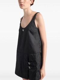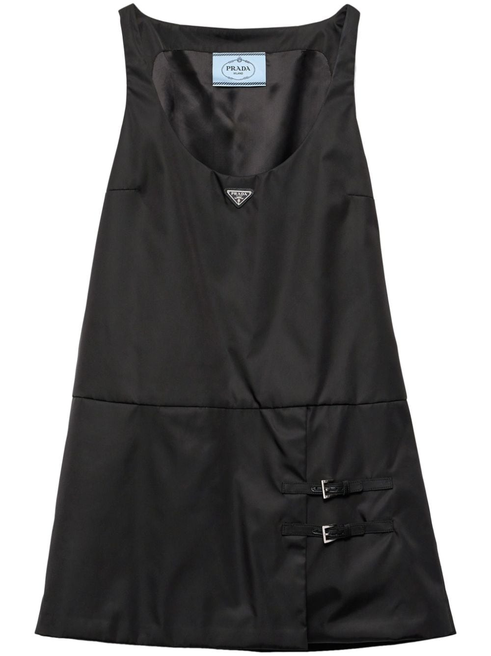 Sleeveless Re-Nylon dress Highlights - Black - Recycled polyamide - Twill weave - Thin straps - Sleeveless - Scoop neck - Enamel triangle logo - Overlapping panel to the skirt - Side double buckle fastening - Full lining - Straight hem - Concealed side hook and zip fastening Composition Outer: Calf Leather 100%, Recycled Polyamide 100% Lining: Viscose 100%