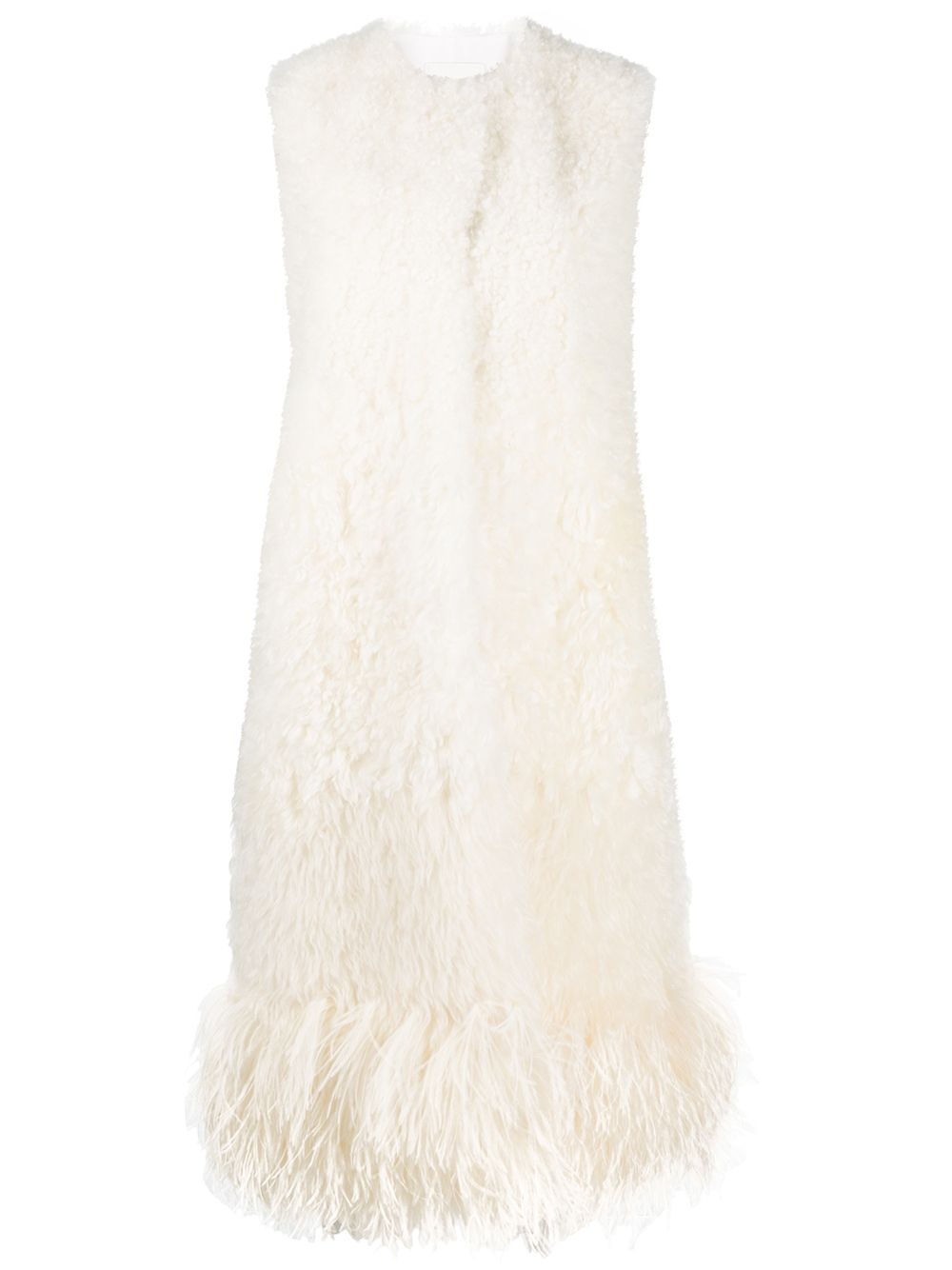 sleeveless shearling oversized coat It's time to make a serious impression. Constructed from shearling and punctuated by feather detailing, this Prada sleeveless coat will elevate your style to the next level. How we love it. Highlights - White - Oversize frame - Feather detailing - Round neck - Concealed front fastening - Sleeveless Composition Lining: Silk 100% Outer: Sheep Skin/Shearling 100%, Ostrich Feather 100%, Turkey Feather 100%, Mohair 80%, Polyamide 20% SIZE & FIT Model measurements Height 5 ft 10 in(1.78 m) Bust/Chest 32.28 in(82 cm) Hips 35.82 in(91 cm) Waist 24.8 in(63 cm) FittingInformation This piece fits true to size. We recommend you get your regular size Cut for a loose fit Made with a mid-weight non-stretch fabric