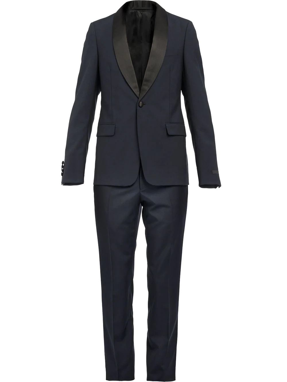 slim fit tuxedo Expertly creating elaborate formal-wear and simple staples alike, Prada has been a fashion favourite for over a century. This SS18 two-piece tuxedo was crafted from navy blue and black wool-mohair blend and silk, featuring a jacket with notched lapels, a front button fastening, long sleeves with button cuffs, a chest pocket and front flap pockets, combined with trousers displaying a slim fit, a waistband with belt loops, a button and zip fly and a cropped length. Composition Outer: Silk 100%, Wool 84%, Mohair 16%