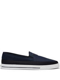 slip-on sneakers Crafted in a navy-blue design, these Prada slip-on sneakers are punctuated with the brand's iconic triangle logo to the front. Set atop a flat rubber sole, the effortless style exhibits the label's sports-inspired aesthetic. Composition Outer: Canvas 100% Lining: Leather 100% Sole: Rubber 100% SIZE & FIT FittingInformation This piece fits small – take one size up