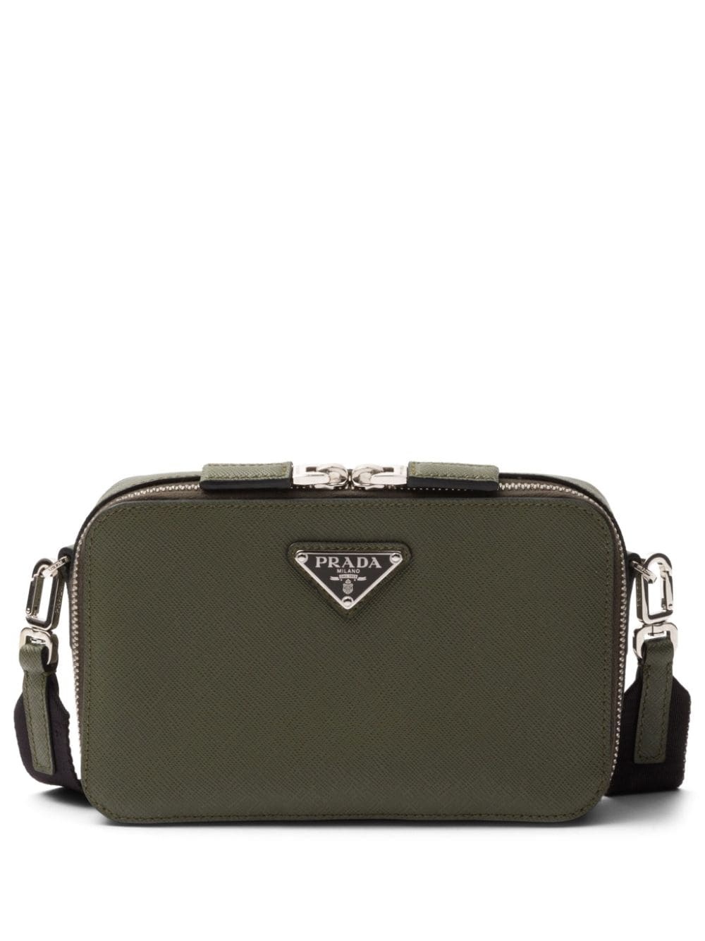 small Brique crossbody bag Highlights - Dark green - Saffiano leather - Enamel triangle logo - D-ring findings - Silver-tone hardware - Adjustable logo-jacquard shoulder strap - Two-way zip fastening - Main compartment - Internal patch pocket - Internal logo plaque Composition Outer: Leather 100%, Enamel 100% SIZE & FIT Measurement STRAP 25.59 in(65 cm) DEPTH 1.57 in(4 cm) WIDTH 7.48 in(19 cm) HEIGHT 4.33 in(11 cm)