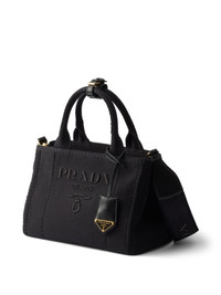 small Jardiniere tote bag Originally seen in 1913 on trunks designed by Mario Prada, the ubiquitous triangle motif decorates the luggage tag of Prada's tote bag. Embroidered logo lettering completes the design. Highlights - Black - Cotton/calf leather - Canvas - Embroidered logo to the front - Enamel triangle-logo leather tag - Open top - Two rolled top handles - Detachable buckle-fastening handle straps - Detachable adjustable logo-jacquard shoulder strap - Metal feet - Canvas lining - Internal logo plaque - Internal zip-fastening pocket - Main compartment - Gold-tone hardware - This piece comes with a certificate of authenticity. - This piece comes complete with a protective dust bag. Composition Outer: Calf Leather 100%, Cotton 100%, Canvas 100% SIZE & FIT Measurement DEPTH 5.9 in(15 cm) HANDLE 4.33 in(11 cm) HEIGHT 7.08 in(18 cm) STRAP 41.33 in(105 cm) WIDTH 10.23 in(26 cm)