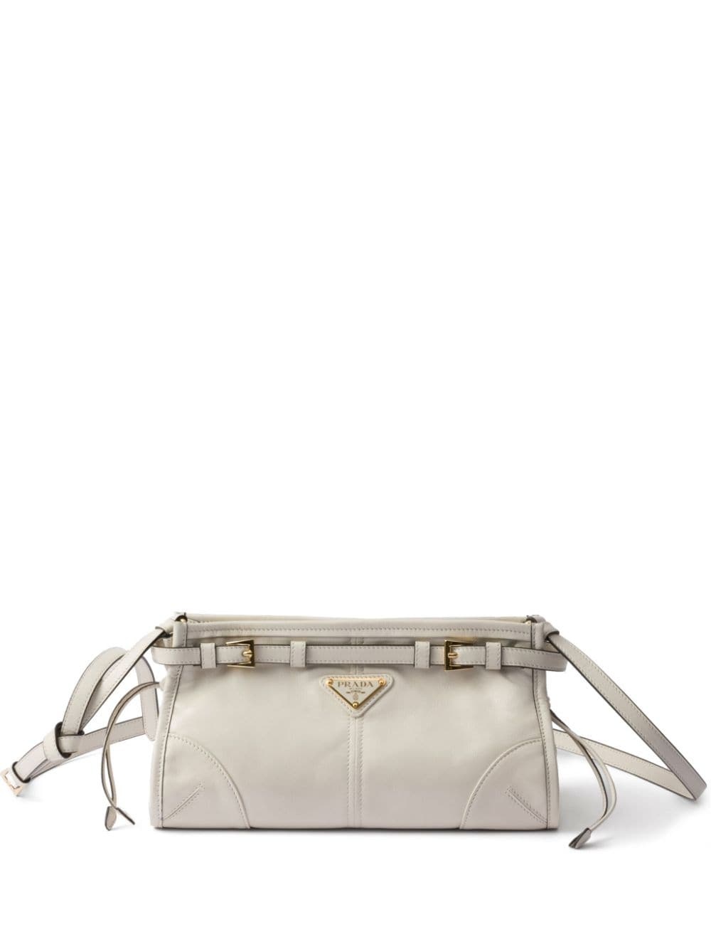 small Bonnie shoulder bag Highlights - White - Leather - Smooth grain - Adjustable detachable shoulder strap - Enamel triangle logo - Gold-tone hardware - Logo-print lining - Internal zip-fastening pocket - Internal patch pocket - Main compartment - Top zip fastening Composition Lining: Nylon 100%, Nappa Leather 100% Outer: Leather 100% SIZE & FIT Measurement DEPTH 4.72 in(12 cm) HEIGHT 5.51 in(14 cm) STRAP 41.33 in(105 cm) WIDTH 10.23 in(26 cm)