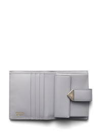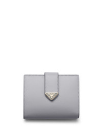 small leather wallet Highlights - Light grey - Leather - Enamel triangle logo - Bi-fold design - Strap closure and press-stud fastening - Internal logo stamp - Internal card slots - Internal note compartments - Coin pocket Composition Outer: Calf Leather 100% SIZE & FIT Measurement LENGTH 4.33 in(11 cm) WIDTH 3.34 in(8.5 cm)