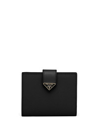 small logo-plaque Saffiano leather wallet Prada's wallet is an ode to minimalism. Designed to hold cash, coins and cards, this all-black iteration is accented with the brand's iconic triangular logo plaque. Composition Leather 100% SIZE & FIT Measurement HEIGHT 4.4 in(11.2 cm) WIDTH 3.34 in(8.5 cm)