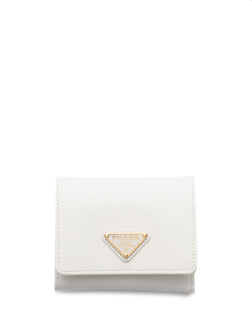 small Saffiano wallet Highlights - White - Saffiano leather - Enamel triangle logo - Tri-fold design - Press-stud fastening - Internal card slots - Internal logo stamp - Note compartment - Coin pocket - Rear card slot - Gold-tone hardware Composition Outer: Leather 100% SIZE & FIT Measurement LENGTH 3.14 in(8 cm) WIDTH 3.93 in(10 cm)