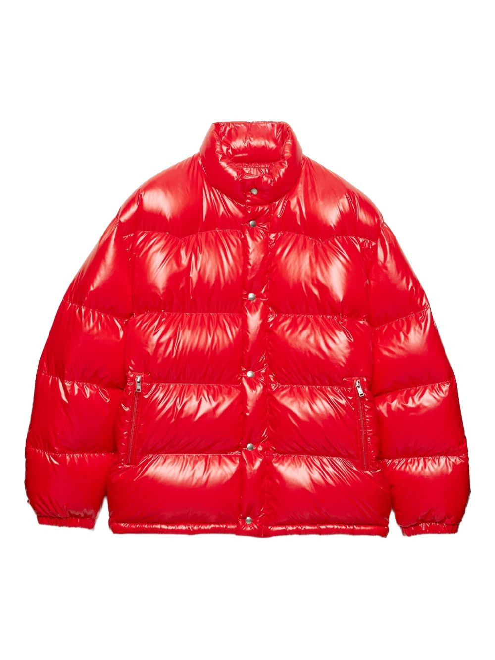 stand-up collar puffer jacket Highlights - Red - Quilted design - Snap button closure - Zip fastening pockets - Drawstring hem - Triangle logo patch Composition Outer: Recycled Nylon 100% Lining: Goose Down 100% Washing instructions Read Manufacturer Guidelines