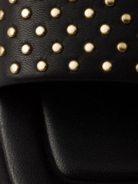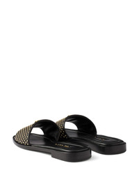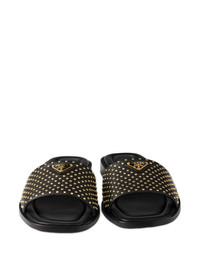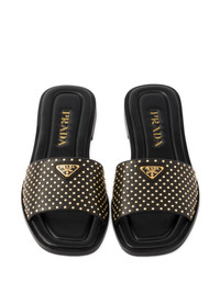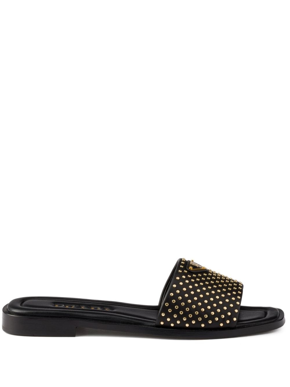 stud-embellished leather sandals Highlights - Black - Square open toe - Flat leather sole - Enamel triangle logo - Gold-tone hardware Composition Outer: Lambskin 100% Lining: Leather 100% Sole: Leather 100%