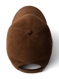 suede baseball cap Highlights - Camel brown - Calf suede - Rear touch-strap fastening - Fabric-covered button at the crown - Six-panel construction - Enamel triangle logo - Curved peak Composition Calf Suede 100%
