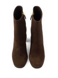 Suede booties Highlights - Coffee brown - Suede - Enamel triangle logo - Ankle-length - Side zip fastening - Round toe - Branded leather insole - Leather sole - 90mm block heel Composition Suede 100% SIZE & FIT Measurement CIRCUMFERENCE 9.64 in(24.5 cm) HEEL 3.34 in(8.5 cm) HEIGHT 5.9 in(15 cm)